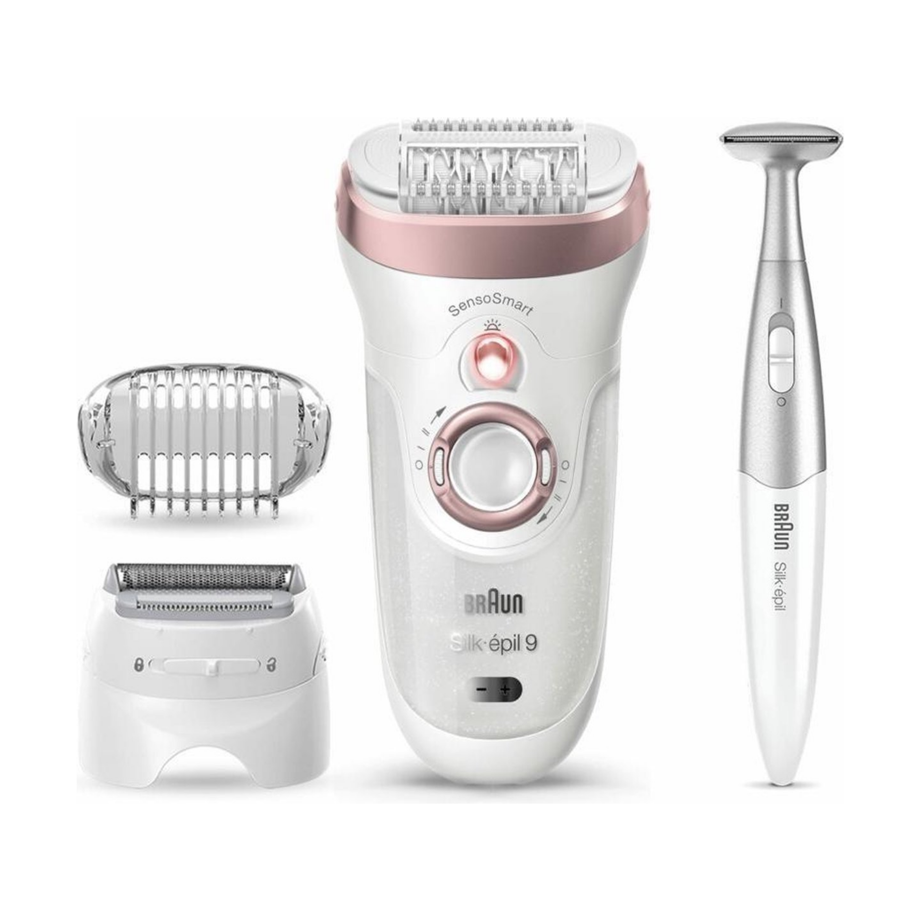 Silk-épil 9, met een brede kop voor een snellere epilatie en ultrasnelle resultaten. Hij heeft extra opzetstukken voor het scheren, trimmen en epileren voor een huid die weken glad blijft, en niet slechts enkele dagen.